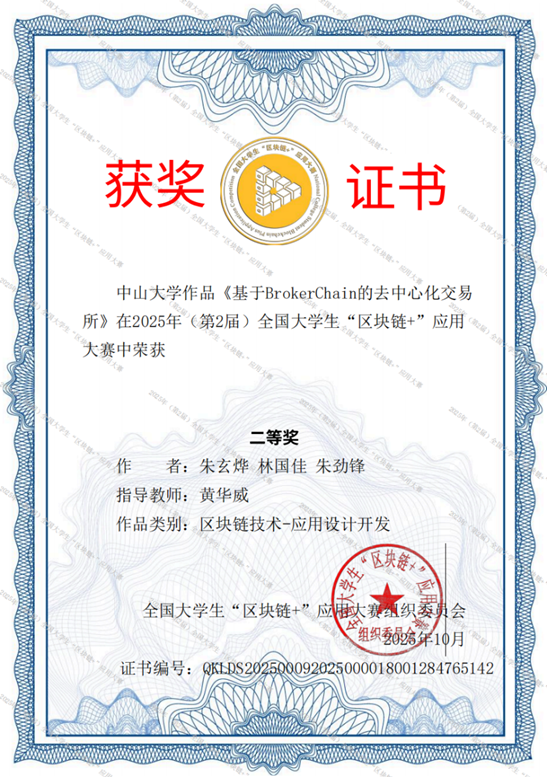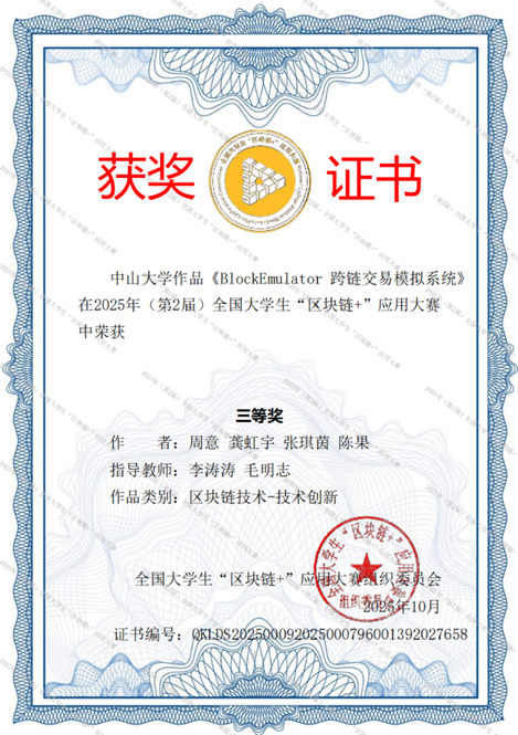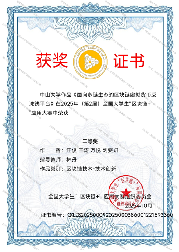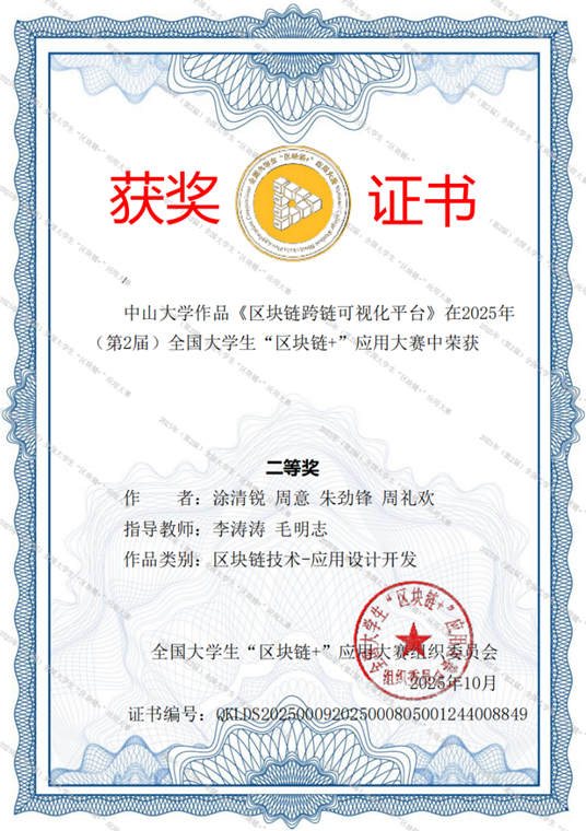 2025年全国大学生“区块链+”应用大赛总决赛于近日圆满落幕。KY开元集团官网四支参赛队伍分别由本科生涂清锐、汪俊、朱玄烨、周意担任队长,在黄华威、毛明志、李涛涛、林丹四位老师的悉心指导下勇创佳绩。参赛同学们凭借创新的项目设计与扎实的实现效果,在全国数百所高校的参赛作品中崭露头角,在华南赛区初赛中表现优异,最终在全国总决赛中荣获国赛二等奖3项、国赛三等奖1项。