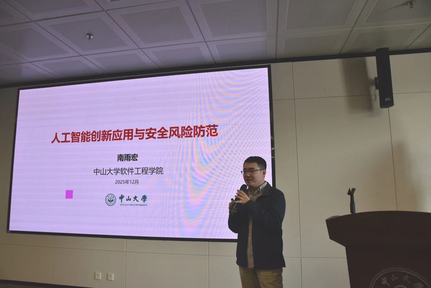 随后,学院南雨宏副教授以《人工智能前沿应用及安全风险防范》为题带来首场主题分享,聚焦大模型与智能体前沿进展,结合制造业全流程应用场景剖析落地风险与应对策略,分享兼具理论深度与实践价值,引发现场热烈交流。