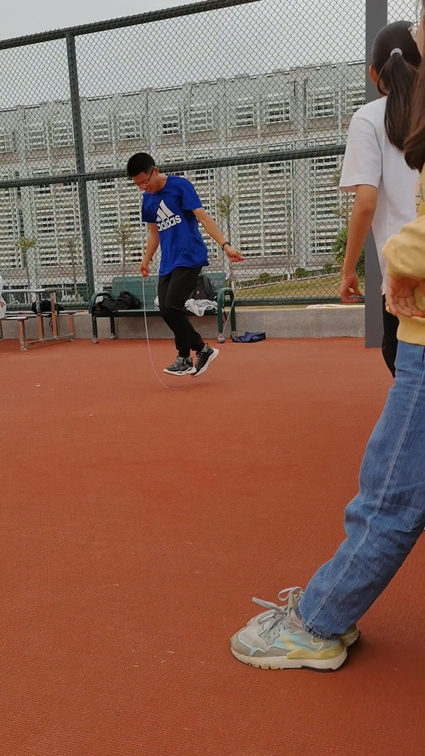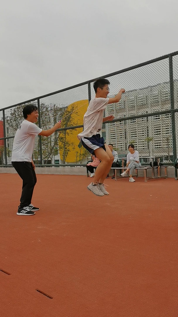 看完紧张的100m比赛,我们进入到了快乐的跳大绳环节。以趣味为主的5min跳大绳,由张恩、卜展鹏等同学组成的小队以128个取得了胜利。其中,我们看到某名“游戏黑洞”同学总是被绳子绊到,都笑得合不拢嘴,气氛非常的愉快。连旁边的观众席的同学也不禁拿起绳子跳起来。
