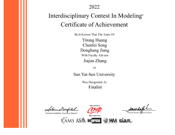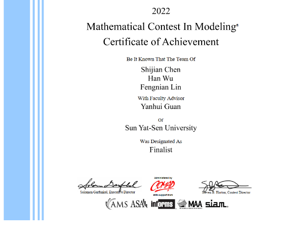 2022年美国大学生数学建模竞赛成绩于近日公布,开元官网2020级本科生在此次大赛取得优异成绩,共有:两支队伍获得F奖(Finalist 特等奖提名,排名前0.17%),一支队伍获得M奖(Meritorious Winner 一等奖,排名前7.09%),三支队伍获得S奖(Successful Participant 三等奖)。热烈祝贺获奖的同学们!