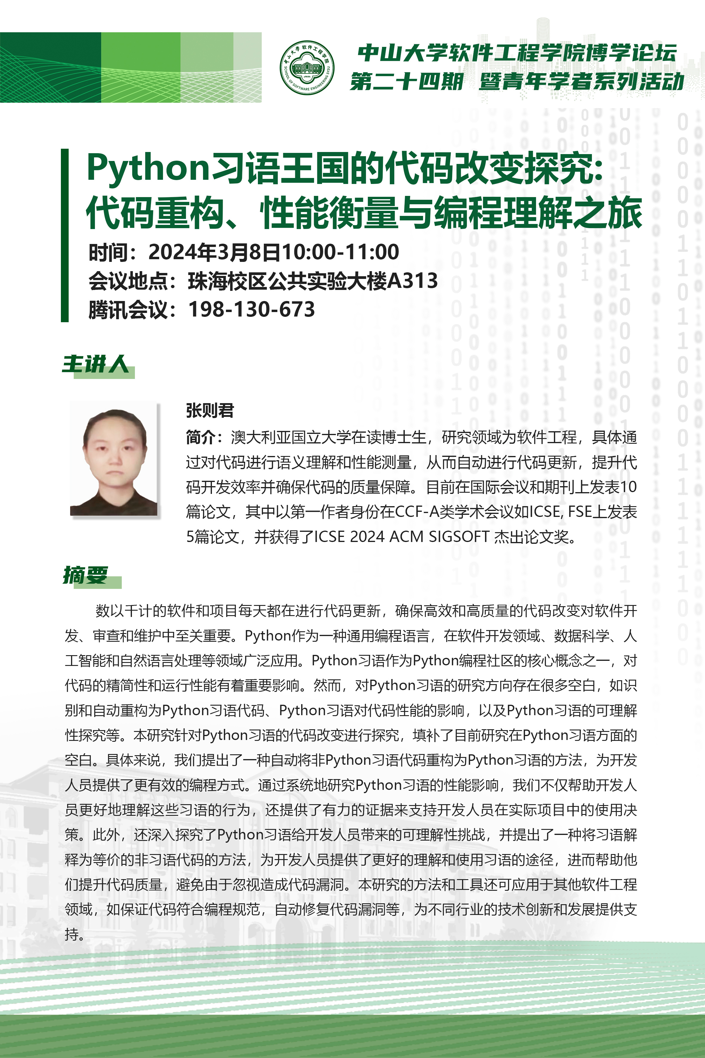 导航痕迹 KY开元集团官网 学术科研 学术讲座 博学论坛第二十四期:Python习语王国的代码改变探究-代码重构、性能衡量与编程理解之旅 博学论坛第二十四期:Python习语王国的代码改变探究-代码重构、性能衡量与编程理解之旅 发布人:林柱良 发布日期:2024-03-07