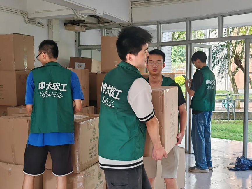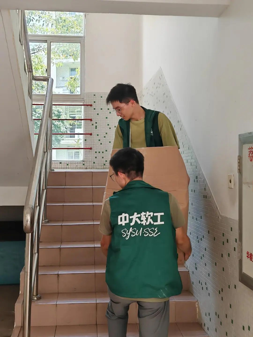 7月12日,一批志愿者提前等候在珠海校区逸仙大道,手举指引牌帮助每位下车的2023级本科生顺利找到对应的宿舍楼栋;另一批志愿者与学院党委蓝澍德副书记、团委书记林柱良老师一起,顶着炎热的天气,将2023级女生未搬完的行李齐心协力一波接一波搬上楼。