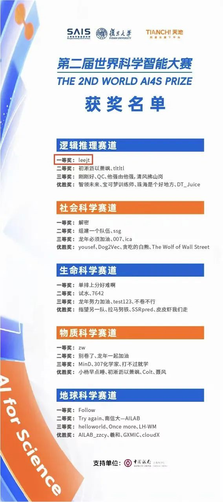 近日,上海科学智能研究院与复旦大学联合主办、阿里云天池协办的第二届世界科学智能大赛圆满落幕。开元官网博士生李金膛在我校陈亮老师、陈武辉老师的指导下,凭借扎实的专业基础和创新实践能力,从24个国家和地区的1085个机构的12687名选手中脱颖而出,获得了大赛总决赛逻辑推理赛道的一等奖(此赛道唯一一个)。