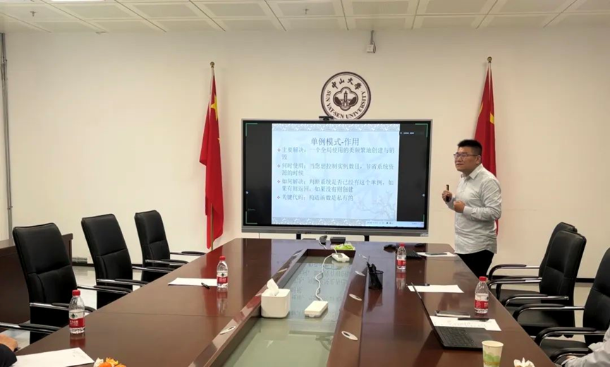 (3)江山老师试讲《程序分析》课程。他首先介绍了静态程序分析的背景和作用,接着讲解了静态分析的基本概念。考核组专家认为江老师授课内容较为丰富,同时建议可以在纯英文PPT中添加一些中文注释便于学生理解。