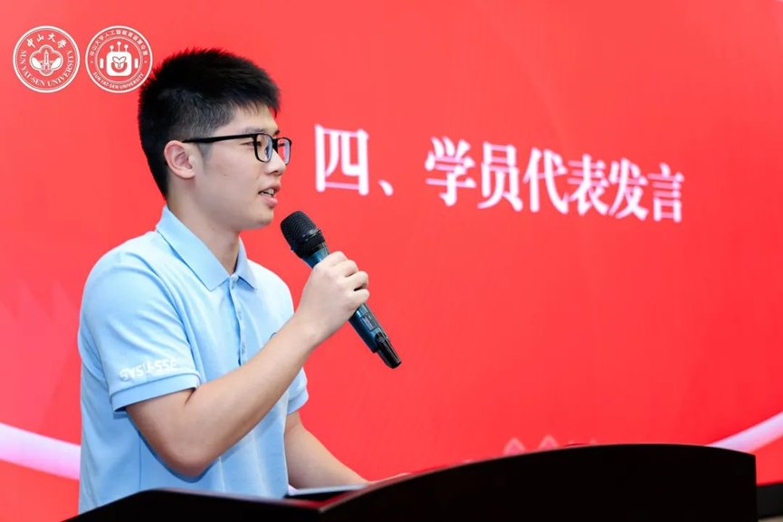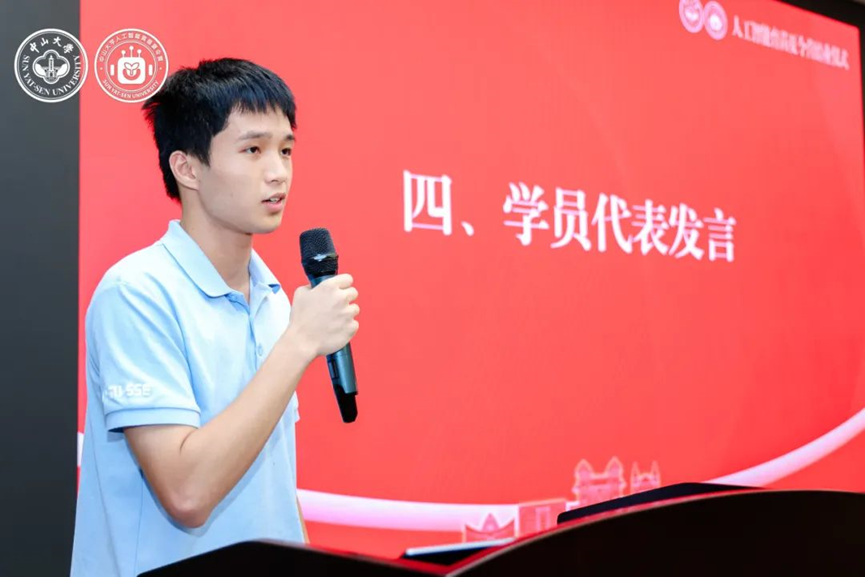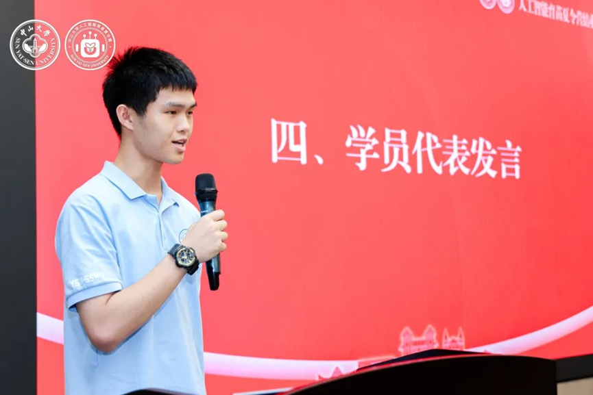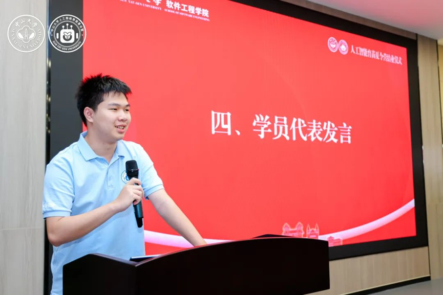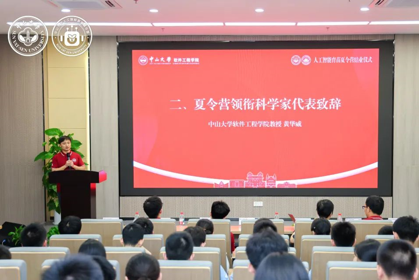 伴随着热烈的掌声,全球前2%顶尖科学家、学院教授黄华威老师作为本次夏令营的导师代表上台致辞。他首先向圆满完成夏令营课程和考核的各位营员表示最热烈的祝贺,随后回顾并总结了同学们的学习经历与成果。他希望同学们未来在学习人工智能技术时,能做到夯实数理基础、秉持人文关怀、保持独立思考,并鼓励他们持续探索、不断创新、超越自我。