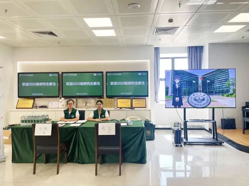 在学院楼A302展厅中,志愿者们积极为新生分发入学资料和学院物资。学院还采取了结合学科特色的迎新方式,在报到现场设置了迎新虚拟数字人,协助解答报到流程、介绍学院办学情况等。