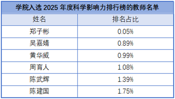 开元官网郑子彬教授、周育人教授、吴嘉婧教授同时入选“终身科学影响力排行榜”和“年度科学影响力排行榜”两个榜单;黄华威教授、陈武辉教授、陈建国副教授(按榜单排名顺序)入选“年度科学影响力排行榜”。
