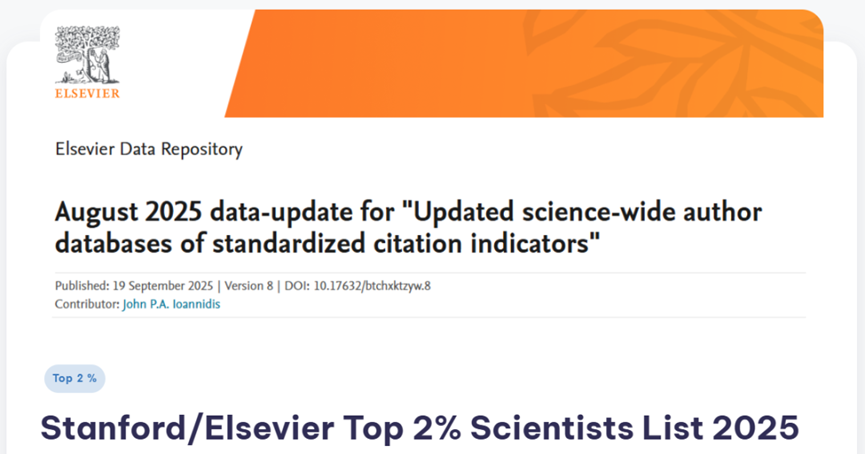 “全球前2%顶尖科学家榜单”由斯坦福大学John P.A. Ioannidis教授团队联合国际权威学术出版社爱思唯尔发布,于2019年7月发布了该榜单的第一期,截至目前已发布八期。2025年更新使用截至2025年8月1日由 Scopus 索引的数据,涵盖截至2024年底的引文、全球约20余万名科学家。