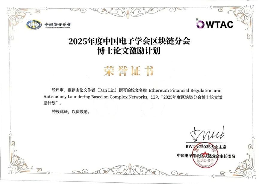 本次大会中,由学院吴嘉婧教授指导、2024届博士生林丹撰写的博士学位论文《基于复杂网络的以太坊金融监管与反洗钱技术研究》(Ethereum Financial Regulation and Anti-money Laundering Based on Complex Networks),入选"2025年度中国电子学会区块链分会博士论文激励计划"。该论文基于复杂网络,针对以太坊面临的账户匿名性、标签稀疏性和交易复杂性等挑战,从数据建模、事前监管(账户类别标记、账户风险评分)和事后监管(洗钱行为追踪、洗钱团伙识别)三方面提出系列技术方案,提升了以太坊区块链安全性,为监管者建立金融监管系统提供理论与技术参考。