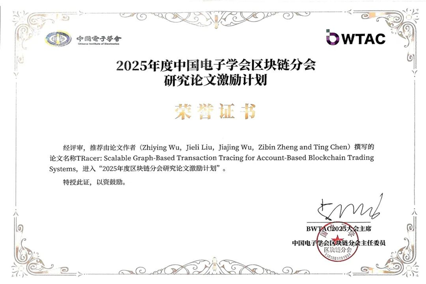 由学院吴嘉婧教授和郑子彬教授指导,博士生吴志颖等人撰写的论文《TRacer: Scalable Graph-based Transaction Tracing for Account-based Blockchain Trading Systems》入选"2025年度中国电子学会区块链分会研究论文激励计划"。该论文针对基于账户的区块链交易追踪问题,提出首个智能追踪工具TRacer,将交易建模为有向加权时序多关系图,通过新颖个性化排序方法(TTR)引导子图搜索,结合局部社区检测,实现高效、通用且低代价的资金流向追踪,性能优于现有启发式和污点分析方法。